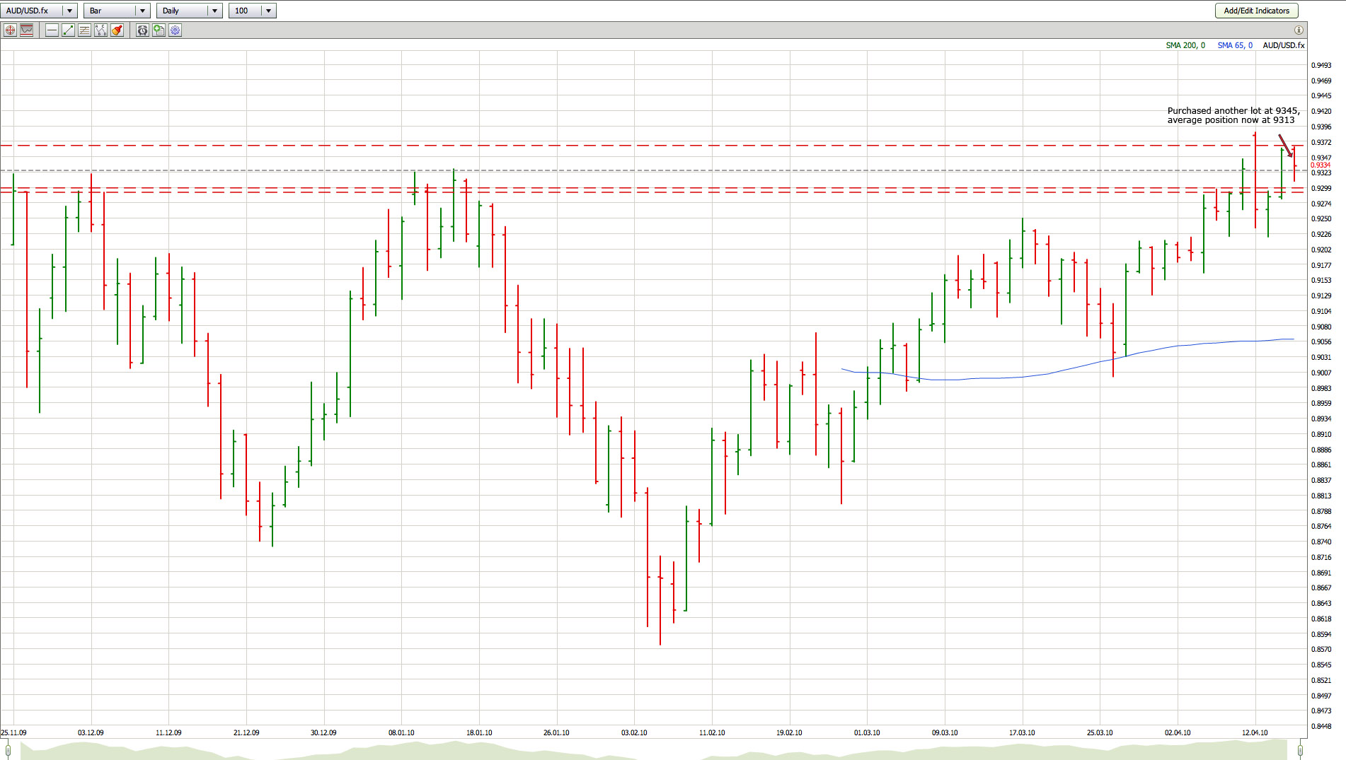 So last week I ended up with +8 pip profit. I am finding that I have gotten at least 30 pip profits initially on almost all trades, but seem to fall back to my break even point most of the time. This week I will explore taking profits quicker and re-entering rather than holding through the draw downs. I'll be sure to write more details on this as I go. I was on vacation at the end of last week so didn't get a chance to make any weekend notes.