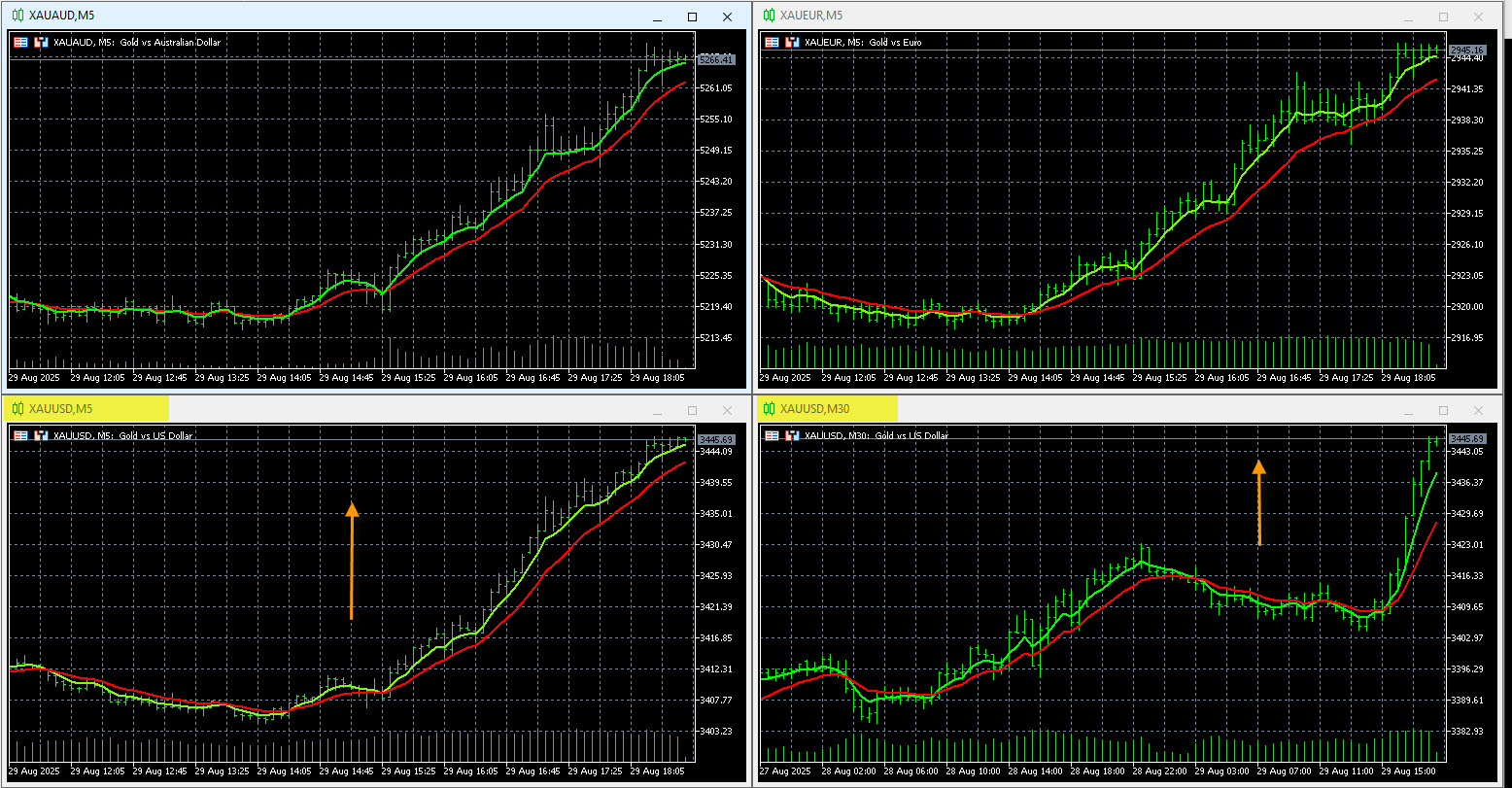 Today in forex trading the forex pairs remained stalled and going sideways. Gold XAU was strong against all currencies and made a strong upward move inside of the D1 uptrend. XAU/USD might be fully broken out now, or has very little resistance left to all time high again. We would scale out lots here and hold some lots to see if momentum continues next week.