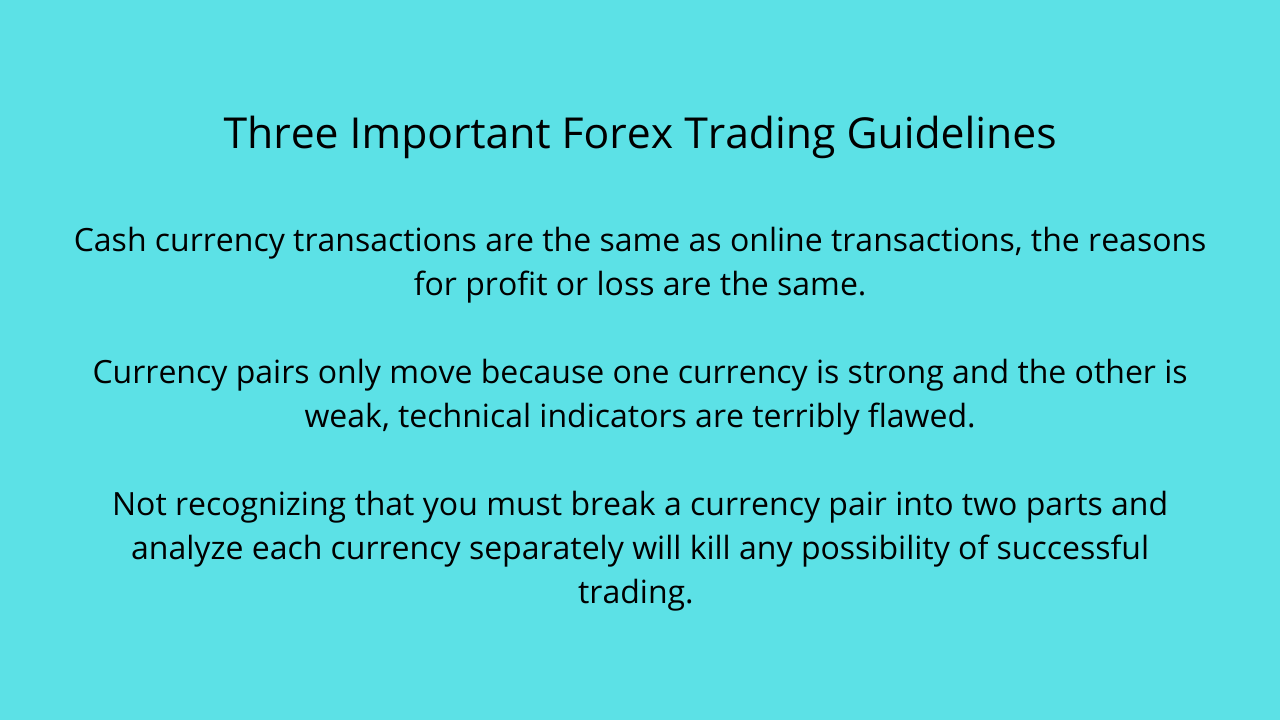 This Youtube video will give forex traders explanations of why cash versus online trades are the same, why currency pairs move, and how to analyze individual currencies, instead of technical indicators, for a complete view. Resources and tools included. Here is the video: