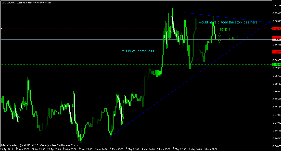 hi, in my stop 1, the candle touched the trend line which is a resistance,then it bounced back. that was the 3rd time it touched the same line. let'say I wasn't in the trade, and I was about to enter, I would have placed sell stop at the bottom of that candle -5 or 10 pips.