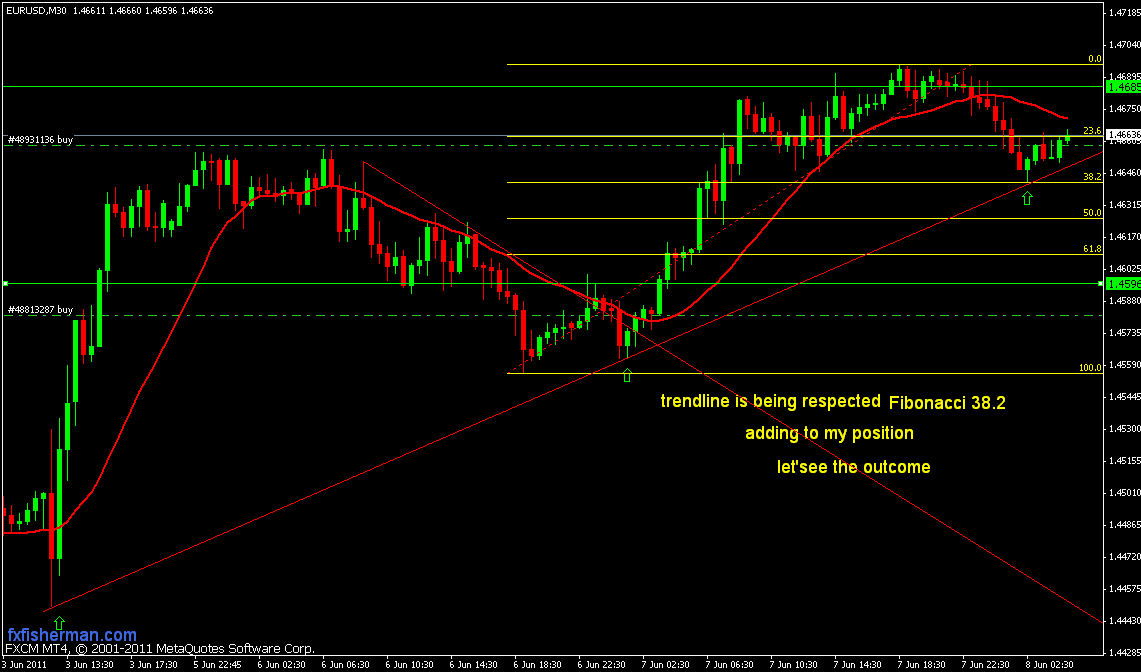 TrendTrader wrote:Here is again eur/usd, I am till going long and adding to my position. Trend line is being respected, fibonacci 38.2% there is a chance it is going to try the high of 1.4750 resistance. Let'see what will happen.