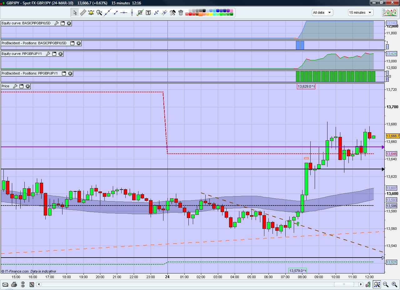 First of all, the most important issue is drawing the down/up trendlines correctly, according to Edward's strategy they are drawn in the 1H timeframe. Please visit his website for a full explanation, it's really quite simple and straightforward. The pivotpoints are daily pivotpoints based on the London market ie. the pivotpoints are updated as the London market opens. The asian range is determined off the 1H timeframe, in this case the upper boundary of the asian range coincidentely coincides with the upper boundary of the 4H range. The green arrow denotes the entry point at 13,582 on the close of the 07:45 candle, exitpoint was at 13,668 on the 09:30 candle, look again at the example which displays the currency pair on 15 m timeframe. The mentioned profit includes the spread of 8 pip.