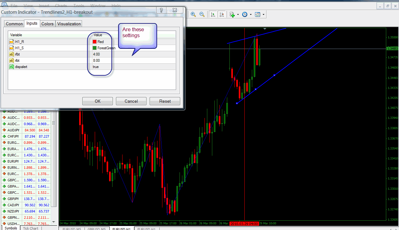 I mentioned earlier, I modified trendlines2 indicator for this strategy. Here it is attached, "Trendlines2_H1-breakout.mq4".
