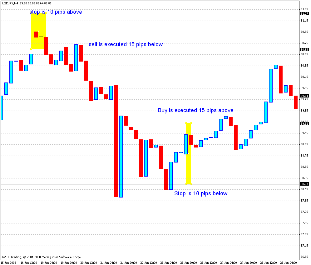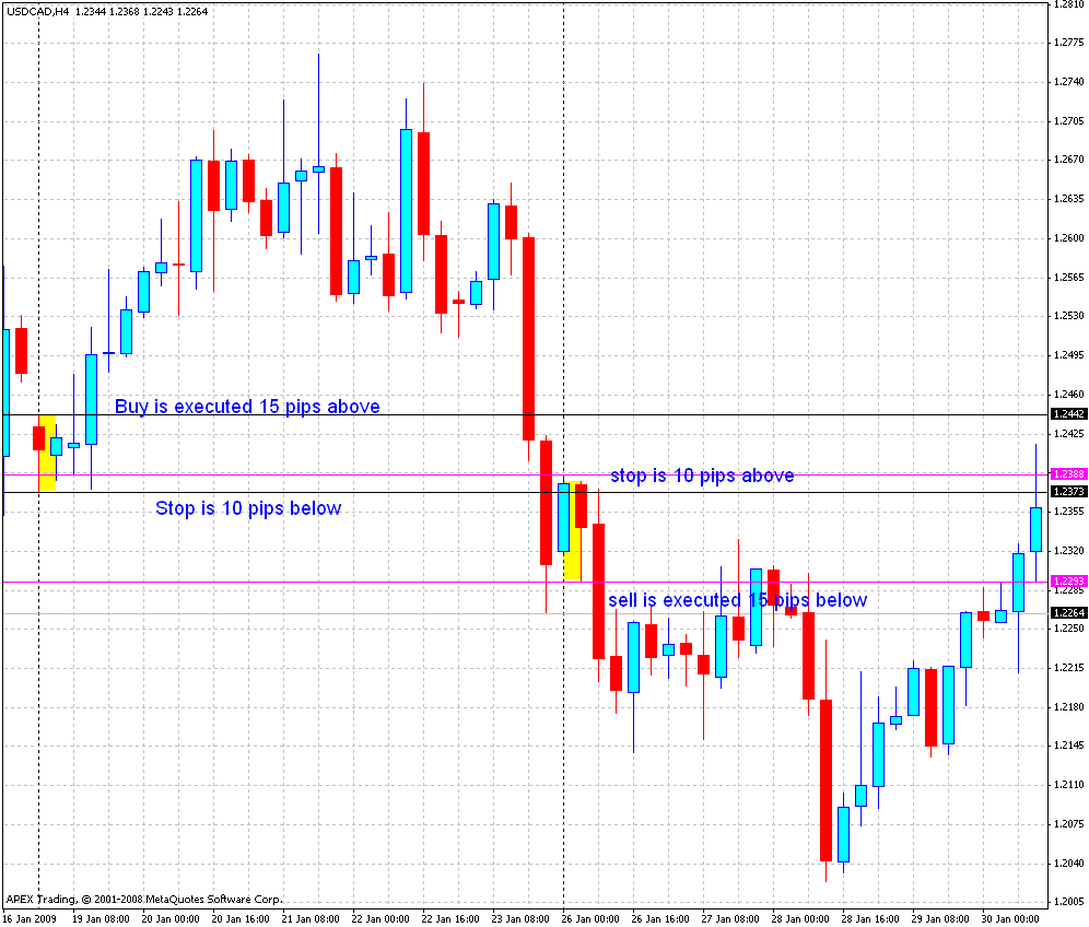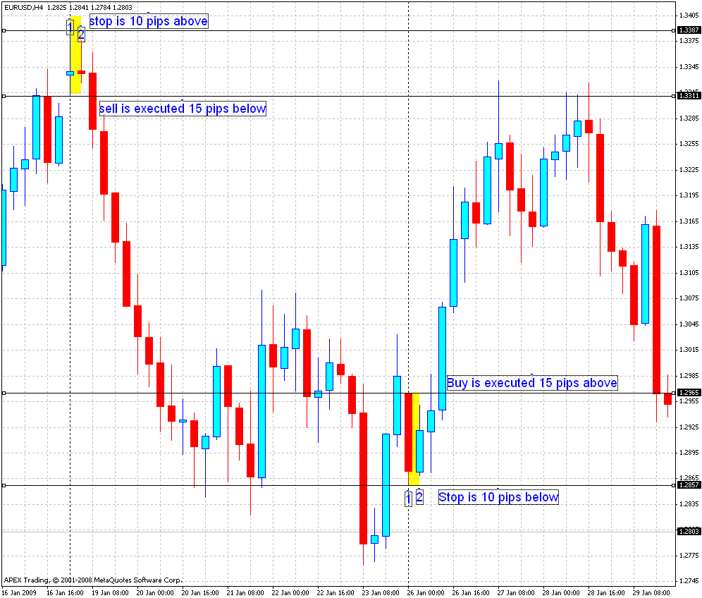 2nd: SellStop orders below the lower low of the two candles by 15 pips, stop loss is above the higher high by 10 pips , and TP = (Higher high - Lower low) * 2 of the two candles