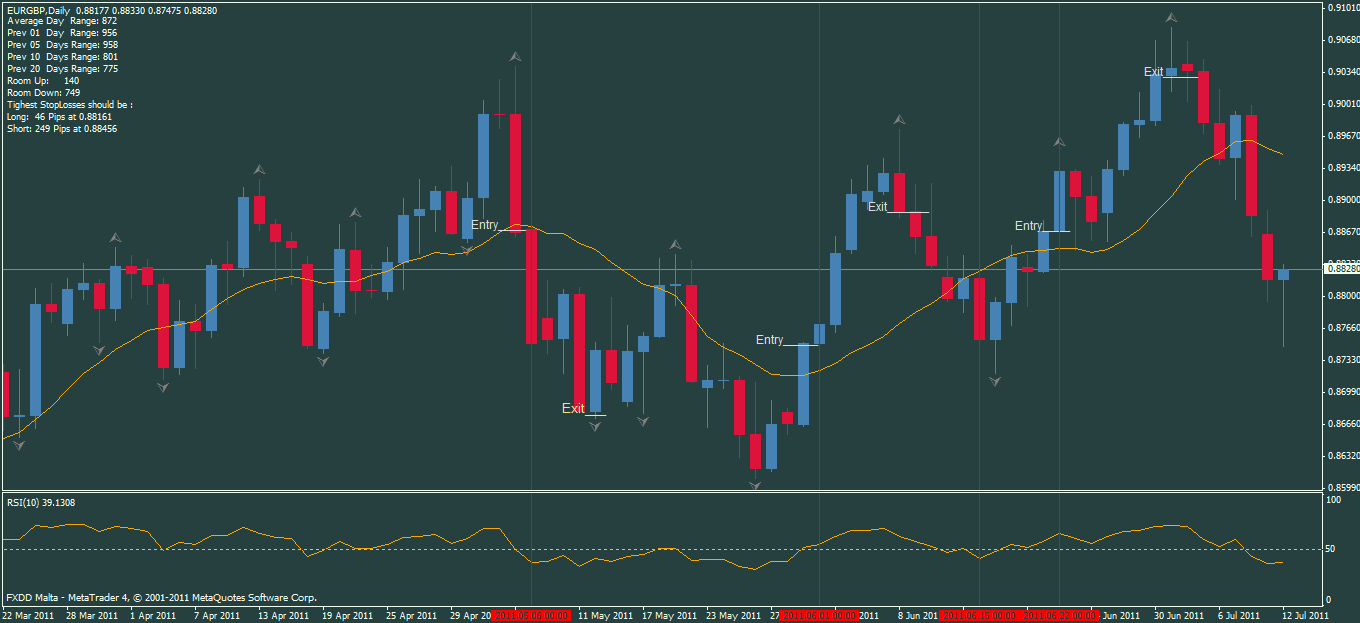 Buy Signals: Wait for a daily bar to open above 13 SMA with RSI 10 above the 50 level.