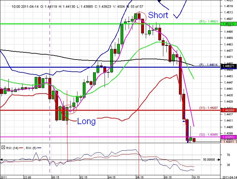 If the price candle(green candle) cuts from below SAM5, below Boilinger Bans's centre line its a LONG call and TP is around 40 pips, and if price candle (red candle) cuts SMA5 from above, above Boilinger band'd centre line, its sure SHORT call and TP is around 40 pips. No need of SL.
