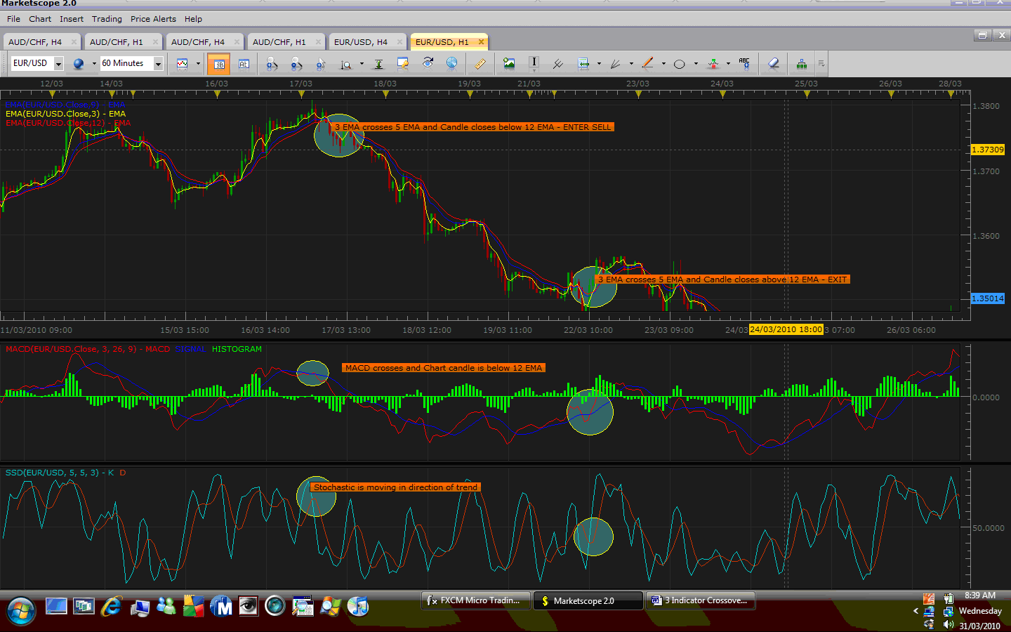 1. On the 4 Hour chart you can see the 3 EMA did not cross the 5 EMA and the Candle body remained below the 12 EMA. Although the MACD and Stochastic were telling us there is a possible trend direction it was short lived – you could stay in the SELL trade if you are brave.