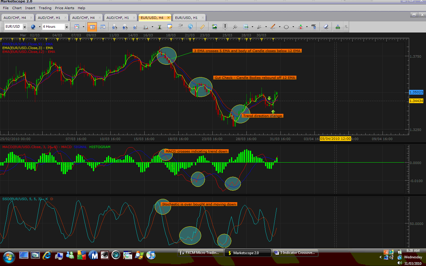 3. Although the MACD and Stochastic indicate a possible change in the direction of the trend we stay in the trade until the 3 EMA crosses the 5 EMA and the candle body closes above the 12 EMA.