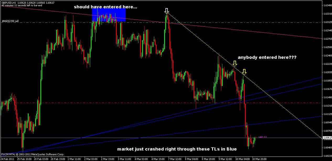 (3)These trades were entered based on the TL drawn from the weekly chart...so what does that mean? It means that the markelt has POTENTIAL to keep moving in this downward direction for weeks...so what does that mean? that means, you take a long term view on these trades and ride it as far as you can...so what does that mean? Lots of pips right? DEFINITELY! so what does that mean if you have missed out on entering as I did? lost your chance right??? Bullshit! If you think that way, you are JUST MISSING THE POINT...and what is this point? the point is (1)...you just read it!!!!!!