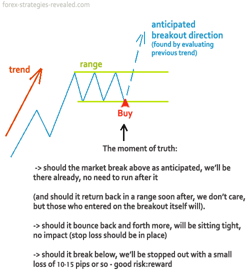 Rule 4: Even better method, so to speak, level UP approach is to enter inside the range in the direction of a trend as shown on the sketch below: