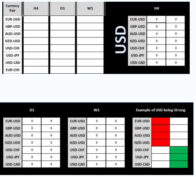 Our forex market analysis spreadsheet is a professional tool which allows traders or currency managers to analyze individual currencies. You can determine which currencies are strong or weak to assist with trend analysis and preparing trading plans for 28 pairs and 8 currencies. Here is more information about this downloadable Microsoft excel spreadsheet: