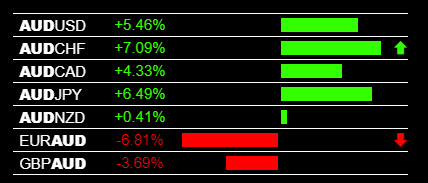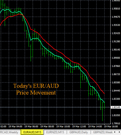 Today in the main session forex trading the AUD was strong on all pairs in this currency group. This drove strong price movements during the main trading session. Images of the live forex trading signals from The Forex Heatmap® and price chart movement for these pairs is shown below. The AUD strengthened and pairs like the AUD/USD, AUD/CHF, AUD/JPY and EUR/AUD all had strong moves against the trends. The signals and movements were very good, but in all cases we would scale out lots or exit any AUD strength trades as more volatility is expected. These live currency trading signals and trend based trading plans for 28 pairs can be found on our website at Forexearlywarning.com.