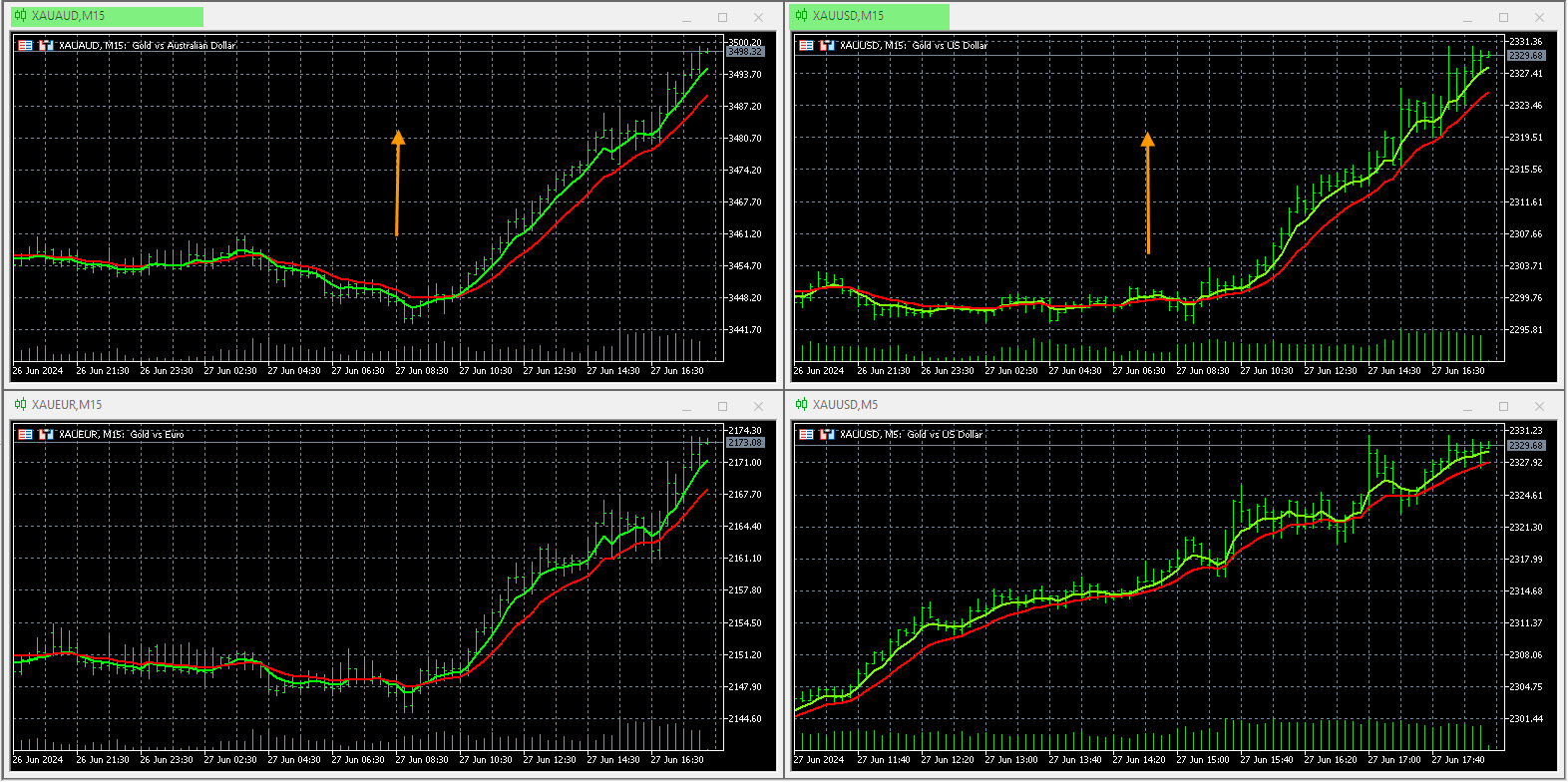 Today in forex trading the market was quiet and consolidating in the main session. Very little movement at all on the 8 currencies. Gold was strong and volatile in the main session and had strong intraday movements across most cross currencies.