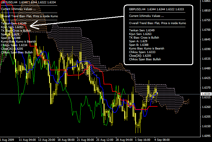 The basic idea is to not only display the valuable Ichimoku Values on top-left hand side of screen (such as Tenkan and Kijun values etc) but also to show an Alert box when Buy / Sell Signals are generated. Here is the list of features: