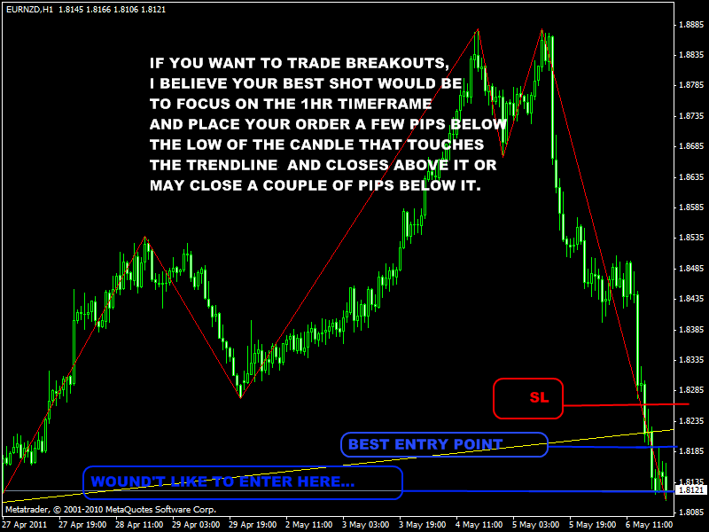 These trendline entry variations Im going to show are not the "textbook" examples as far as the rules of the TL strategy are concerned (in terms of drawing trendlines) but it does pay to know them and also have the ability to spot them. Some very good trades setups occur on these.