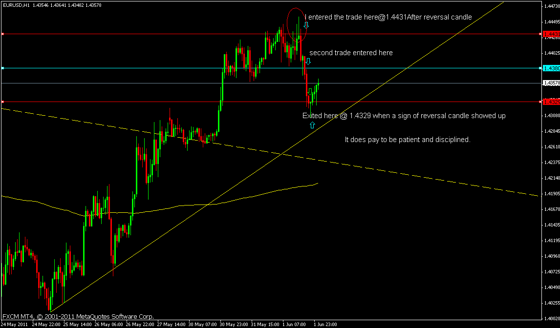 It does pay to be consistent with our plan. The first trade I entered earlier triggered a stop loss, but I managed to get back in after a strong reversal candle showed up at the resistance level"learning from the pro" it paid over 100 pips, and I entered a second trade @1.4380 and got an additional 50 pips extra.