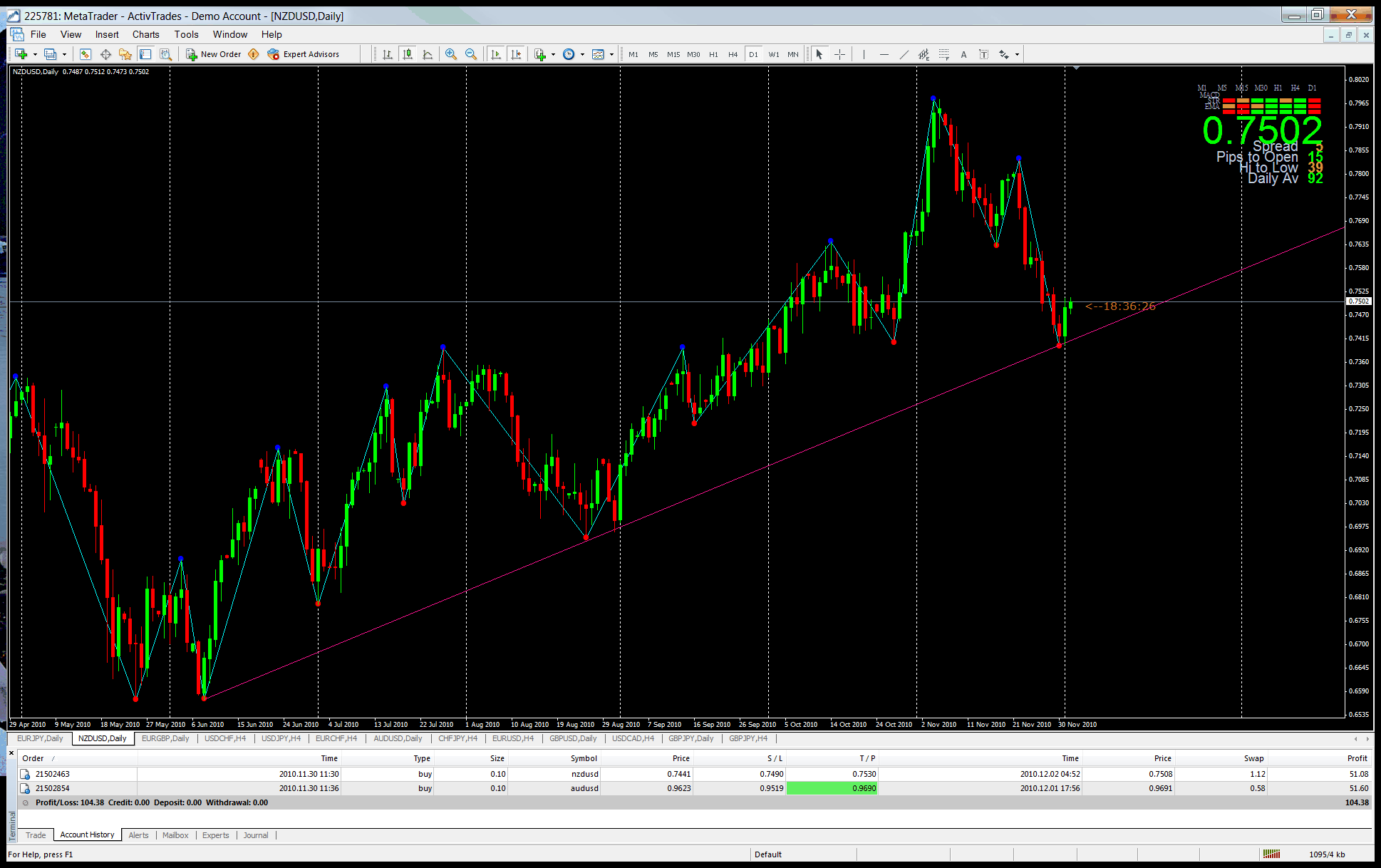 Also booked 580 pips on the Euro with 2 orders. Went Long because I was under the impression that the main trend is still up. Lucky I guess.
