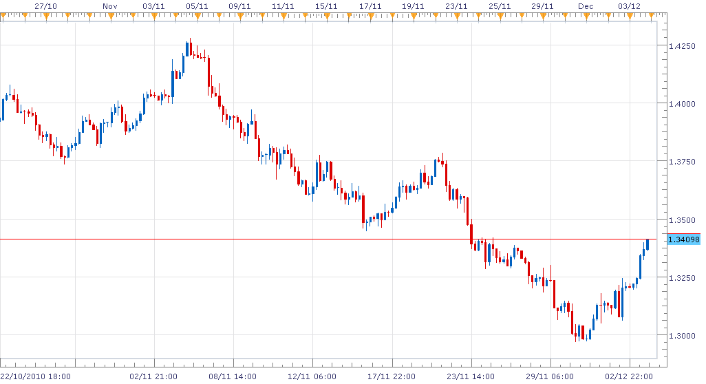 Think the poor nonfarm payroll and higher unemployment rate helped (http://www.dailyfx.com/forex/market_alert/2010/12/03/U.S._Nonfarm_Payrolls_Adds_39K_in_November.html).