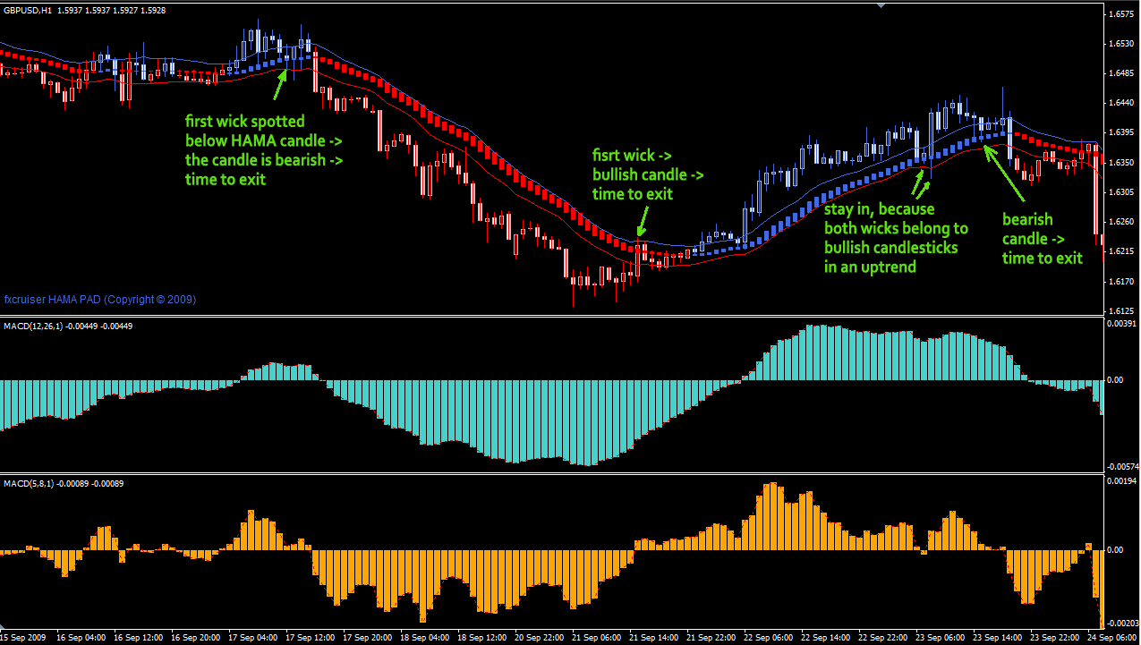 exit when MACD goes below the zero mark or HAMA turns redand below tunnel.