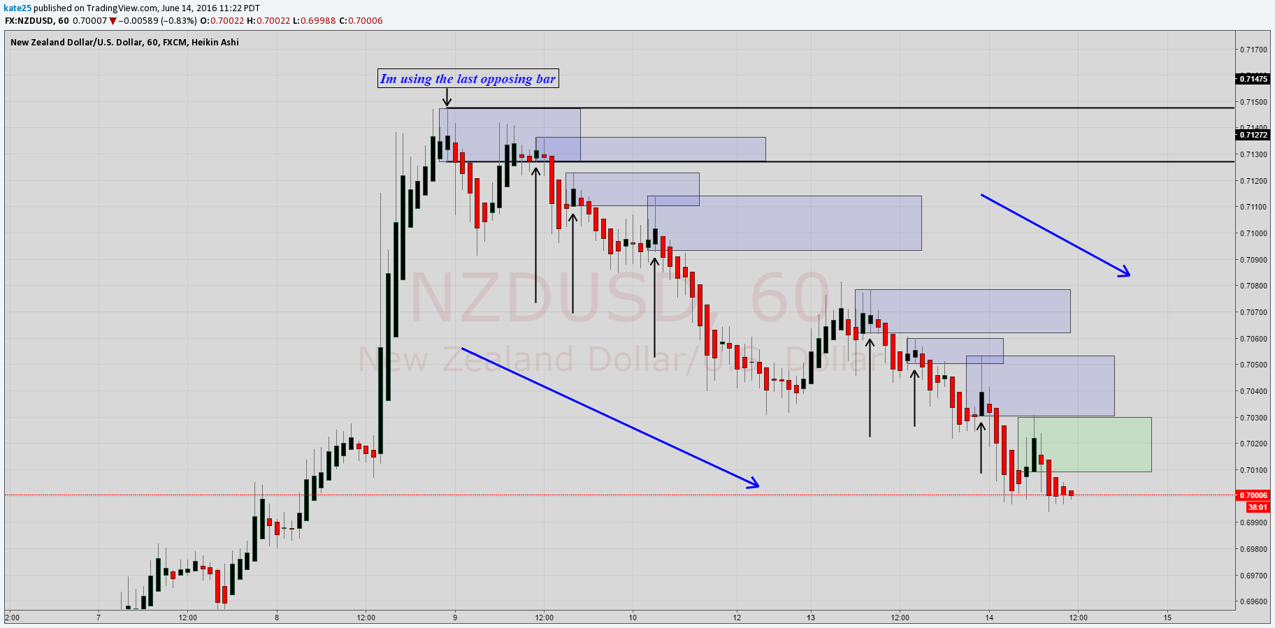 Hi everyone I have an idea on Heikin Ashi charts. As everyone knows it is an average bar chart and runs smoothly. It also quiets the noise down for supply and demand levels. let me bring up a chart for discussion
