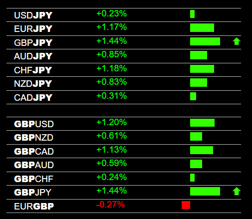 Today in forex trading the EUR and GBP were mostly strong and the JPY and CAD were mostly weak, producing good intraday price movement. The EUR/JPY, GBP/JPY, and CHF/JPY all moved up on the H1/H4 time frames. The GBP/JPY and EUR/JPY are nearing some resistance clusters, so scale out lots on any buys and scale out more lots as they continue higher. The CHF/JPY has more upside to 131.00-131.50. The GBP/USD and GBP/CAD also moved higher today on the H1/H4 time frames. On both pairs, once again scale out lots as they move higher into a resistance cluster just above the current prices. The movements were good today but all of these pairs have limited additional upside. These live currency trading signals are available at: