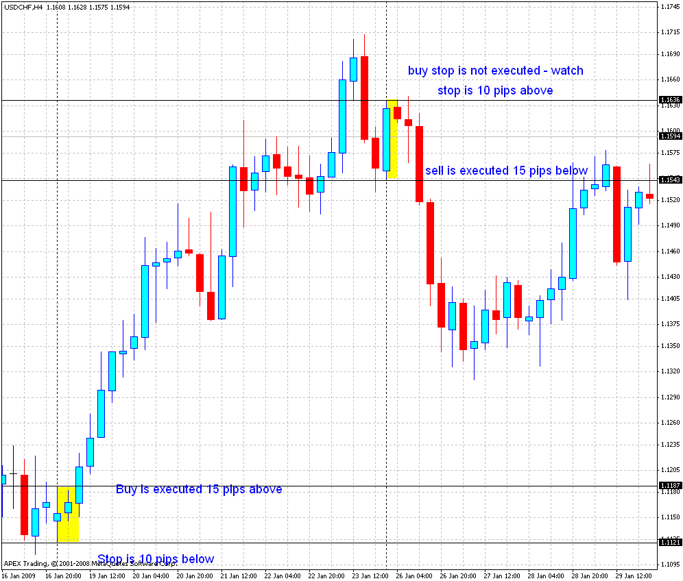 2nd: SellStop orders below the lower low of the two candles by 15 pips, stop loss is above the higher high by 10 pips , and TP = (Higher high - Lower low) * 2 of the two candles