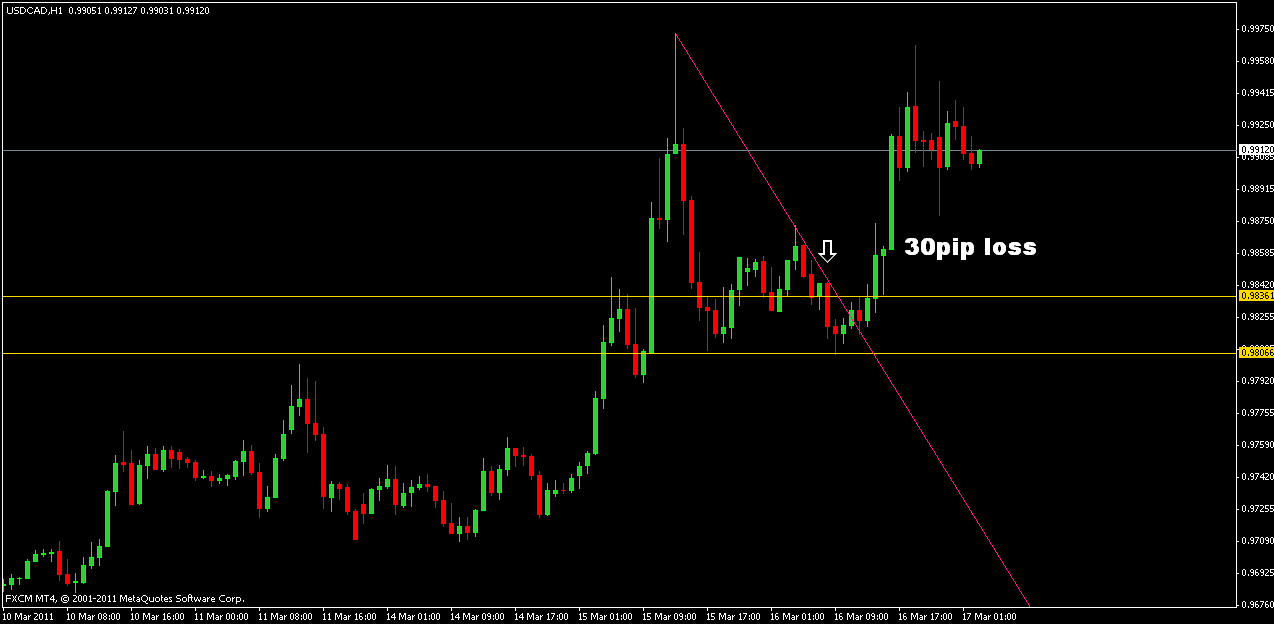 30 pip loss on usdcad trade, 19 pips profit on eurusd...exited on eurusd because didnt like the candle that formed there